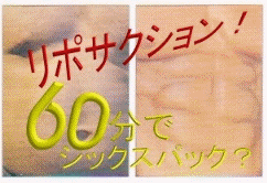 「誰もが求めるシックスパック(腹直筋)。 なりたくて、なりたくてたまらんシックスパック。 夢にも見たシックスパック。 なのに何でお前は逃げるのじゃ?」 と嘆いた人は一人や二人では済まないでしょう。 ホント誰もがこれを求めて、ジムではゲロを吐くほどクランチや腹筋をがむしゃらにやっているのです。 しかし分ってない・・・ そんなに腹筋運動をがんばっても、あまり意味が無いという事を・・・。 もともと腹筋を浮かび上がらせたければ、腹筋運動などしなくても良いのです。 極端な話、その腹筋と皮膚の間にある脂肪さえ除けば誰でも見事なシックスパックが浮かび上がるのです。 それでもインフォマーシャルでは、アブフレックスやアブローラーなるものをやっていれば、シックスパックが手に入るような事を宣伝しています。 ところでリポサクション(脂肪吸引手術)というのをご存知でしょうか? いわゆる太い注射器の様なパイプを、皮膚に穴を空けたところから突っ込み、バキュームで掃除機のようにパイプをゴリ〜ゴリ〜と動かせながら脂肪を吸い取る手術です。 恐らくこんな事をするのは、余程太った女性しかしないだろうと考えるでしょうが、実際アメリカでは、男性が非常に多いのです。 しかもです、しかもそんなに太ってない男性達なのです! その理由は一重に血管が浮き出たシックスパックを手に入れたいからなのです。 ニューヨークマガジン誌によると、マンハッタンの有名美容整形外科でリポサクションをする多くのお客は、トレーナー、エアロビクスのインストラクター、フィットネス競技者、スポーツ選手、ボディビルダーとなっているそうです。 何れも自己の理想への限界を感じた時に、リポサクションを頼る事になるそうです。 リポサクションの普及は、新しい吸引テクノロジーの導入が原因となっています。 しかし現在でも、部分的な脂肪除去のみで、沢山の脂肪を一気に取り除く事は無理です。 また肥満解消の為のものでも有りません。 この手術名を専門用語で、チュームセント・リポサクション(tumescent