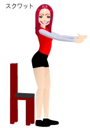 右アニメーションの様に、足を腰幅に広げ、背筋を伸ばしたままゆっくり軽くお尻が椅子に着くまで下します。 その位置からお尻を絞るように立ち上がります。 この動きを8〜12回を2〜3セット行います。 |
