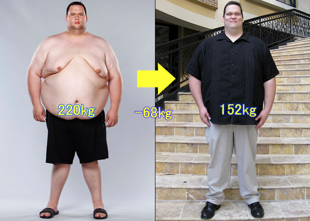 (注:元の体重が大きかったからこそ、大きく体重減が出来たのであって、元々こんなに太ってない人が減量しても、これ程の減量は不可能です。 また、減量には代謝率など個人差があるので、無理をしないように気を付けましょう)
