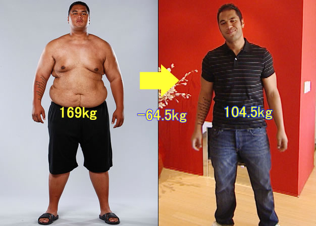 (注:元の体重が大きかったからこそ、大きく体重減が出来たのであって、元々こんなに太ってない人が減量しても、これ程の減量は不可能です。 また、減量には代謝率など個人差があるので、無理をしないように気を付けましょう)