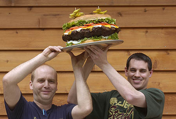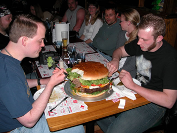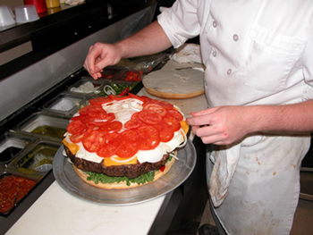 この巨大なバーガーを生んだのは、Denny's Beer Barrel Pub(デニーズ・ビヤーバレル・パブ)で、世界一巨大なハンバーガーを販売するとしてギネスレコードに登録されるかもしれません。 デニーズのビッグハンバーガーには、2ポンド(900g)、3ポンド(1.36kg)、6ポンド(2.72kg)の三つのサイズが用意されており、6ポンドを3時間以内に平らげれば、料金無料の他、お店オリジナルT-シャツのプレゼント、また壁には栄誉としてあなたの名前を掲げてくれます。 「どんなレストランでも客寄せのメニューが必要さ。 我々はそれがハンバーガーなわけ」と 話すのは、このレストラン経営者の息子で、副社長を務めるデニス君。 噂を聞いて訪れる客は、オーストラリアや西海岸のカリフォルニアからもあり、6ポンドのバーガーを食べてみたいと挑戦するらしい。 お店では1週間に30個ほどの注文があるそうです。 因みにこの15ポンドのバーガーには、マヨネーズとケチャップとマスタードがそれぞれ1カップ半の他、レタス1個、玉ねぎ2個、トマト3個、スライスチーズ25枚が、4.7kgの牛挽肉とパンの上に乗ります。 作るのにはコツがあり、脂肪の少ない赤身牛の挽肉を、卵とパンと秘密の素材をつなぎとし、オーブンで2時間半焼きます。 焼き上がったら、ピザ用のショベルで調理場に運び、そこで2.5kgのトッピングが盛り付けられます。 「腕が痛くて・・・」と、キッチン主任を務めるウィリアム氏は、作業をジムのエクササイズに例えます。