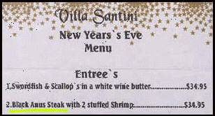 ”2匹のエビの詰めものと、黒い肛門のステーキ”という風になり、実際アメリカ人にはそう聞こえるのです!