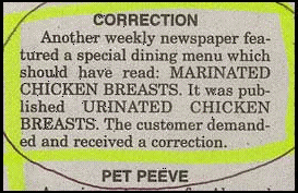 他の新聞の記事でレストランのスペシャルメニューを紹介したのですが、本来”マリネートされた鶏の胸肉”と書くべきが、ユリネート(しょんべんが掛かった鶏の胸肉)”とタイプされ発行されてしまいました。