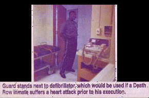”守衛の横に有るのがディフィブリレーター(心臓に高圧電流を流しショックを与え蘇生させる機器)で、死刑囚が死刑執行前に心臓発作を起こして命が危ぶまれるような時の為に用意されています”