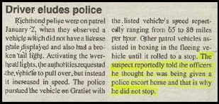 1月2日リッチモンド警察がパトロール中ナンバープレートが無く、テールランプが壊れた車を見つけました。 パトカーはランプを付け、車を止めるようにマイクで指示しましたが、車の速度は上がる一方で、スピードは時速100〜128キロで逃走したそうです。 その後他のパトカーも追跡に加わり、やがて逃走車が横転して動きがつかなくなったそうです。 捕まった犯人はお巡りさんに、”家まで帰るのに警察がエスコートしてくれていると思ったから車を止めなかったんだ”と言い訳したそうです。