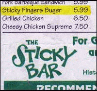くソーセージの名前でしょうが、別の意味で”手癖の悪い”という意味も有ります。 それに加え、Burger(バーガー/ハンバーガーの意)と打つべきが、間違ってBuger(バガー)になっています。 Bugerは”ヤツ”という相手を見下げた呼び方で、全体の意味として”手癖の悪い奴”と受け取れます。 ”一字違いで大違い”とは良く言ったものです。
