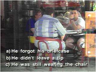 下の彼はこの昼食を終えた後、オフィスに戻ってから ある事に気づきます。 A)ブリーフケースを忘れた事に気づく B)チップを置き忘れた事に気づく C)イスがずっと付いたままになっていた事に気づく