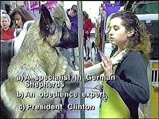 この犬は一目見ただけで、誰に調教されたか分かりますね さて、誰でしょう? A)ジャーマン・シェパードの調教師 B)盲人犬調教師 C)クリントン大統領