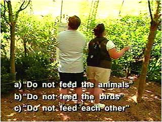どうやらこの2人、園内の警告に気づいたようです。 何て書いているのでしょう? A)動物にむやみにエサを与えないで下さい B)鳥にむやみにエサを与えないで下さい C)お互いむやみにエサを与えないで下さい