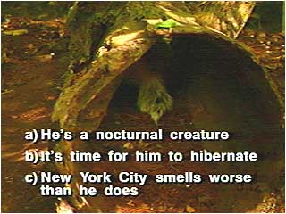 下のスカンクは木の中に入って行きます。 ナゼでしょう? A)夜行性だから B)冬眠に入るから C)ニューヨーク市は自分の匂いよりクサイから