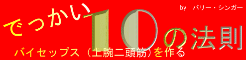 やもすれば、勢いあまって後頭部を床に打ちつけんがばかりに反り返ります。 そんな輩にはこう尋ねます、「新しいスタイルのデッドリフトですか?」と。 この様な方法でバーベルカールをしても、決してバイセップスは大きくなりません。中にはアーノルドの現役当時のビデオを観て、チーティングを用いているから自分も試してみようと考える人もいると思いますが、アーノルドの場合は例外で、彼は元々バイセップスが大きくなる素質があったというもので、極端な話し、どんな方法でトレーニングをしてもバイセップスが大きくなった訳です。ですから、彼の様な異例を自分にあてがってはいけません。 あくまで基本は、チーティング無しで挙がる範囲の最大重量を扱う事です。