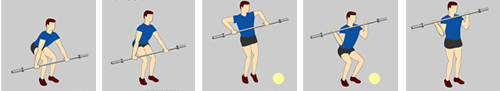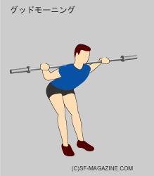 脚を肩幅に開いた上体でバーベルを肩に担ぎます。 その状態から背を反らしたままゆっくりと前かがみになります。 およそ上体と脚が90度近くになったら、上体を起こし始めます。