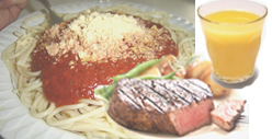 2PM 食事(ステーキとパスタとフルーツジュース)
